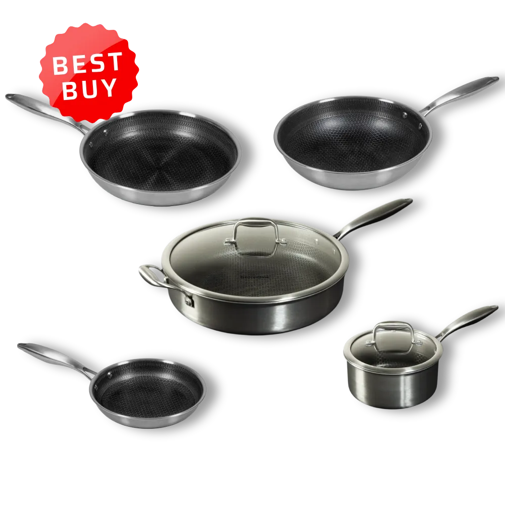 Our advanced stainless steel matrix features a revolutionary laser-etched hexagon design, creating peaks and valleys filled with a super non-stick coating. This ensures even heat distribution and effortless cleanup with the non-stick functionality and the durability of stainless steel or cast iron.